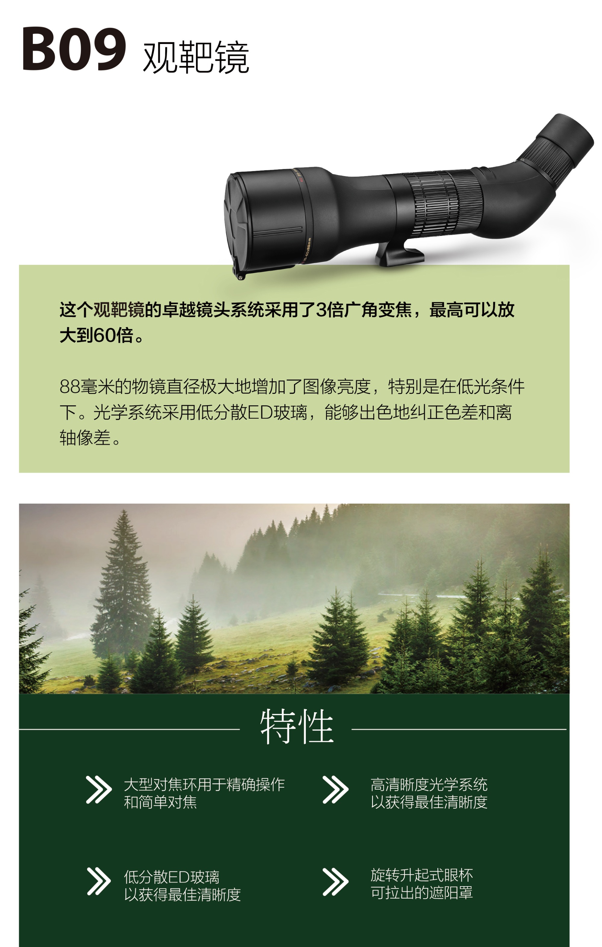 B09的卓越镜头系统具备3倍广角变焦,最高可放大至60倍 特性: 。超低色散(ED)玻璃可实现最佳清晰度 。大焦点环,用于精确操作和简单对焦 。高清晰度光学系统,用于获得最佳清晰度 。拉出式遮阳罩 。可旋转的眼杯