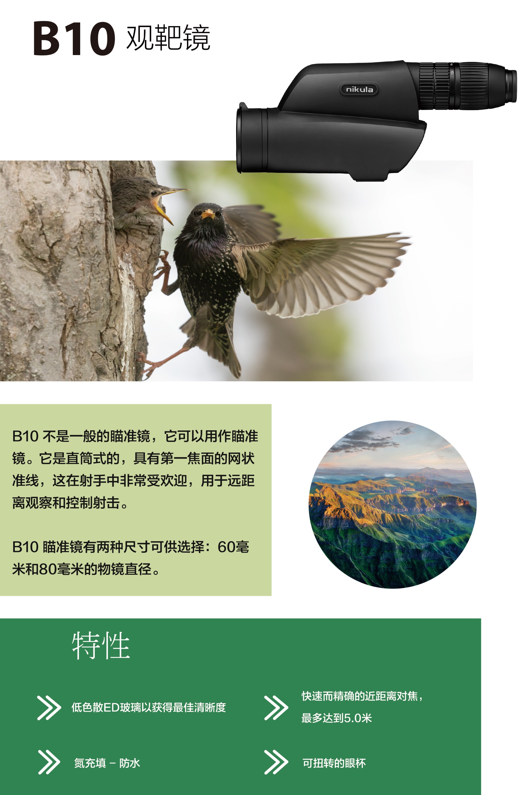 B10可以用作瞄准镜, 因為它是直筒型的,也配备了第一焦平面的准线,所以這款观靶镜可說这在射手中非常受欢迎 特性: 。高清晰度光学系统可实现最佳清晰度 。超低色散(ED)玻璃可实现最佳清晰度 。最短對焦距離僅4米 。旋转式眼罩和屈光度可调整 。充氮气防水